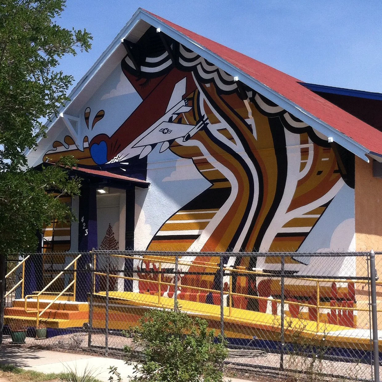 Acrylic 30’x30’ Collaboration with five teen assistants: Felice Foster, Alyssa Johnson, Juissa Rivera, Michelle Perez, and Angel Pavia. Sponsored by Working Classroom. Abq NM